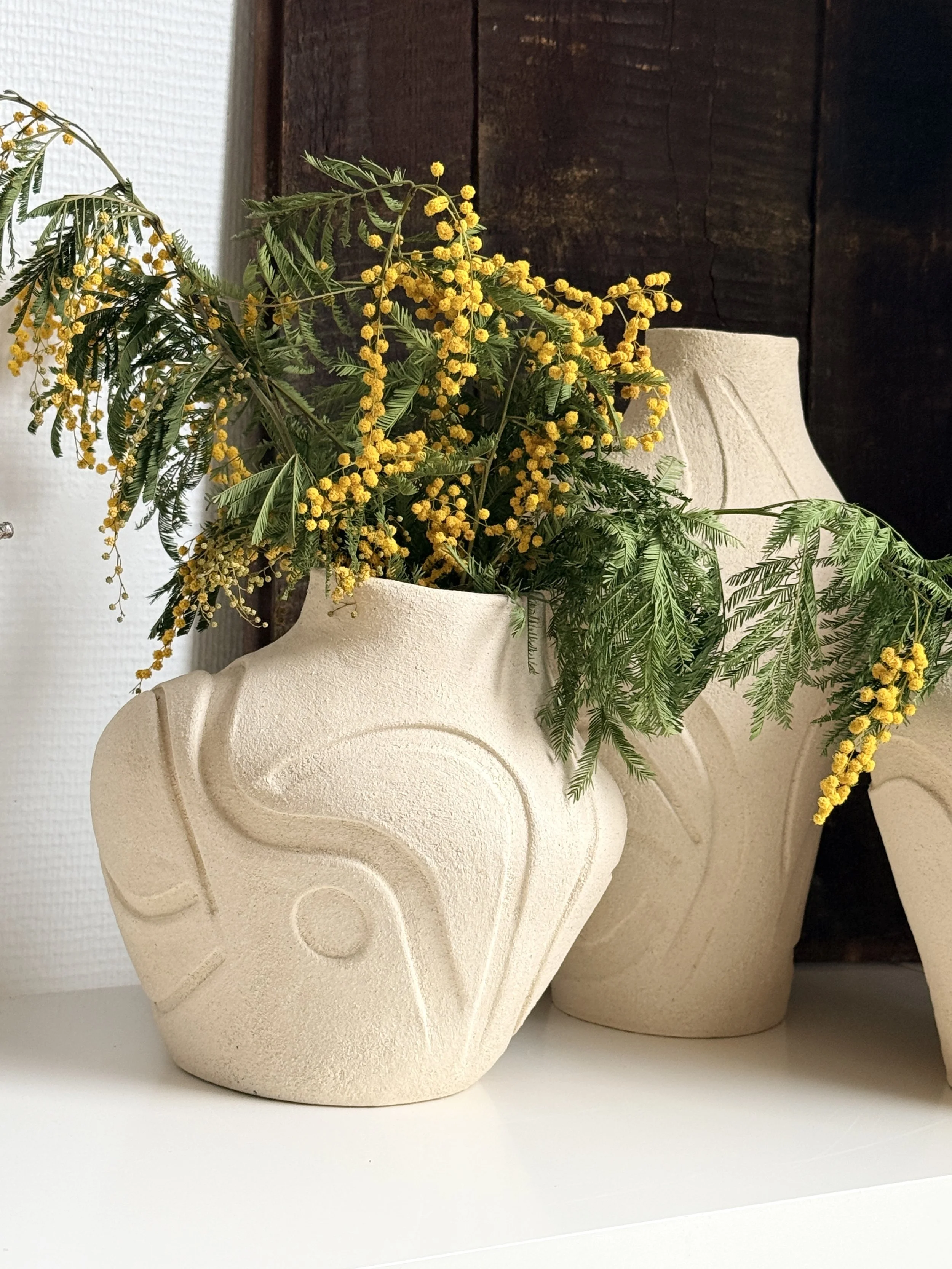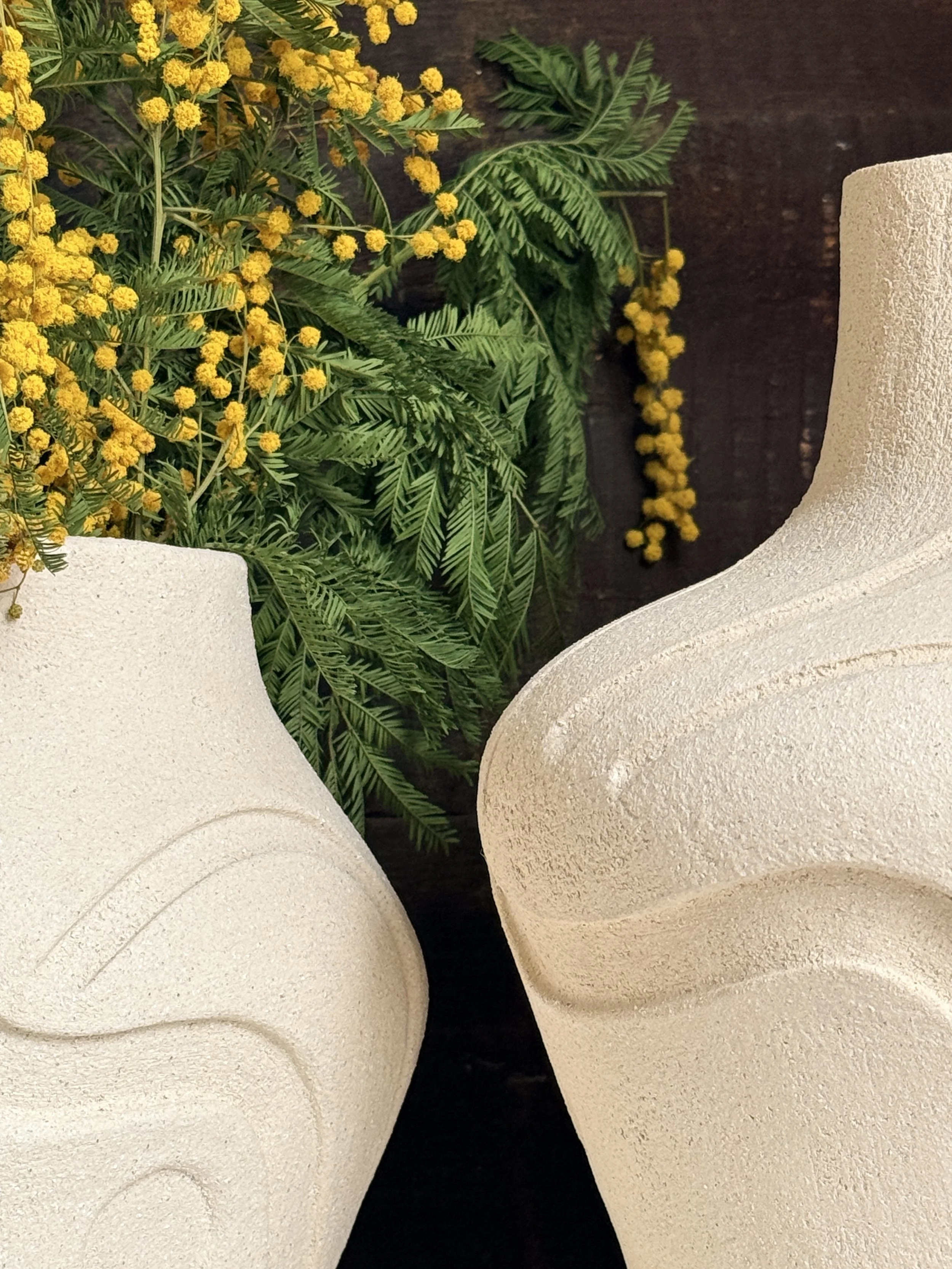 This collection is inspired by the natural shapes of Mediterranean rock reliefs. Each piece is an exploration of textures, where the clay is transformed into a canvas. The organic curves hand-drawn by the artist's are carved directly into the clay, offering a tactile and visual experience.